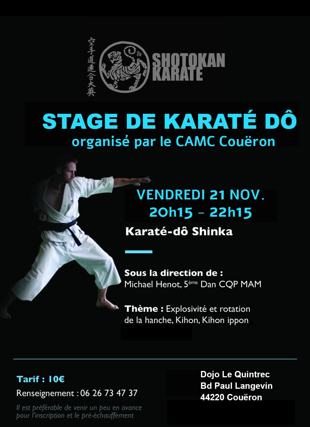 Ce stage sera donné par M. Fabrice Bosch, 6e dan, au dojo (Jean-Claude Lequintrec, 2-8 bd. Paul Langevin, Couëron). Il se déroulera de 10h00 à 12h00 et coûte 10€ (remboursés par le club pour nos adhérents).