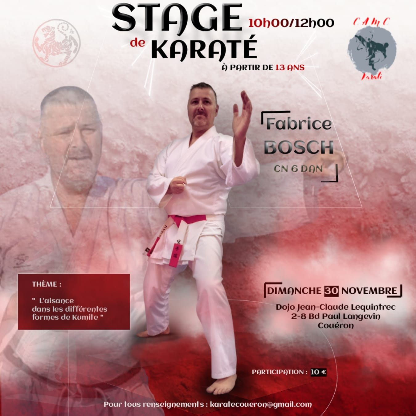 Depuis l’an dernier, le club a pris l’habitude d’organiser des stages afin d’offrir à chacun de nouvelles occasions d’apprentissage et de partage. Le prochain aura lieu le dimanche 30 novembre 2025, au dojo de Couëron (Jean-Claude Lequintrec, 2-8 bd Paul Langevin), et sera animé par M. Fabrice Bosch, 6e dan.